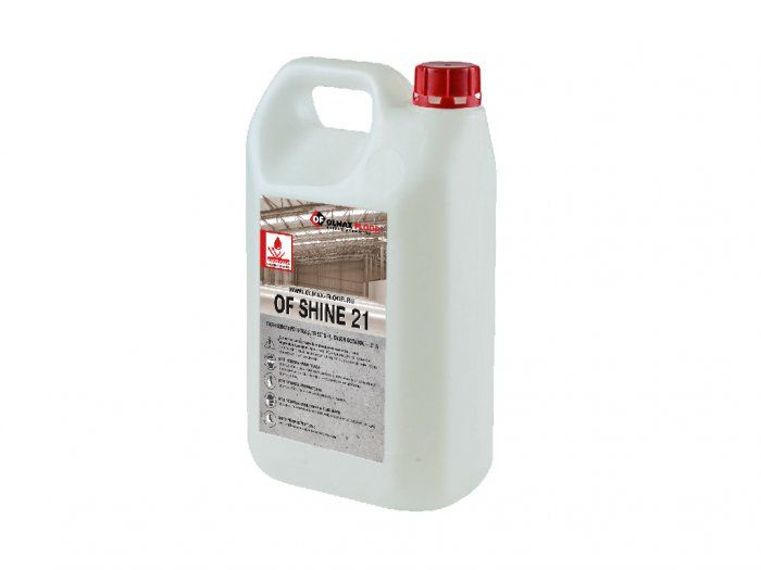 OF Shine 21 (Шайн 21), сух.ост 21%– литиевая, высокоглянцевая пропитка с повышенной стойкостью к проникновению агрессивных сред, используемая для улучшения глянца, увеличения твердости, химической стойкости шлифованного и полированного бетона. Продукт обладает двойным действием: литиевые силикаты проникают в бетон, упрочняют его, и в тоже время полимерные компоненты формируют прочную и «дышащую» микропленку на поверхности, которая не отслоится при эксплуатации пола.