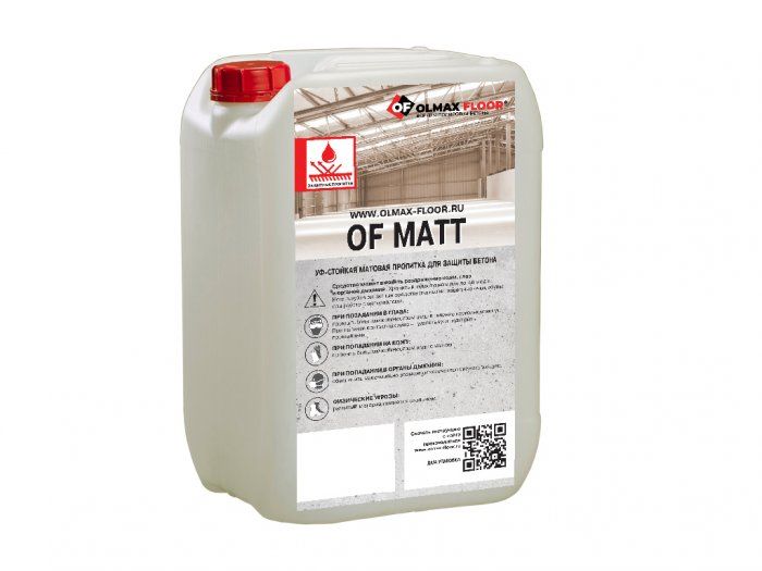 OF Matt (Матт) – прозрачная УФ-стойкая матовая пропитка для защиты декоративного/архитектурного бетона полов и стен (полированный бетон, терраццо, топпинг, литые бетонные элементы, тротуарные элементы), которые требуют повышенную защиту от загрязнения, потери цвета, циклов замораживания-оттаивания.