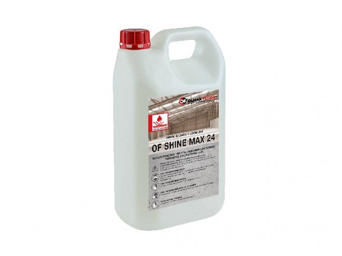 OF Shine Max 24 (Шайн Макс 24) – литиевая, высокоглянцевая пропитка с повышенным содержанием полимеров с высокой стойкостью к проникновению агрессивных сред, используемая для улучшения глянца, увеличения твердости, химической стойкости шлифованного и полированного бетона.